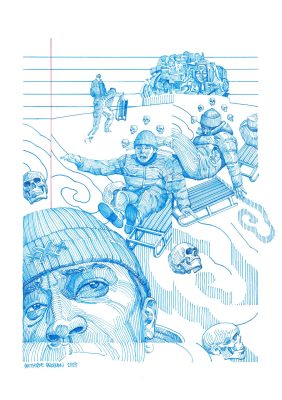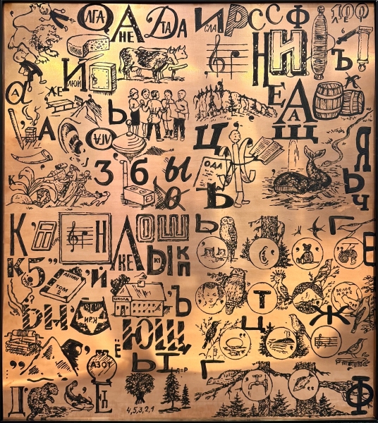 В секции графики представлена серия «Домашнее задание» (калм. «Герин даалhвр»). Это в определенном смысле отражение жизни в Калмыкии в 1990-х и 2000-х годах, на которые пришлось детство автора. В этих работах художник исследует свои непростые отношения с калмыцким языком – вопрос, актуальный для многих представителей его поколения.