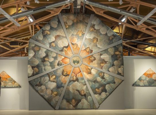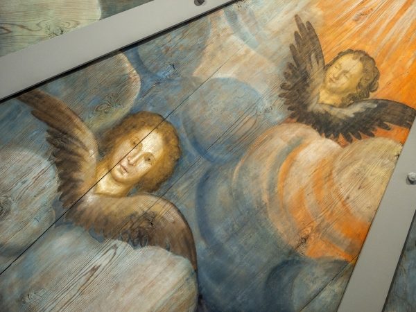 Главные экспонаты выставки «Свобода и глушь» – «небеса» – расписанные библейскими сюжетами потолочные перекрытия деревянных часовен конца XVIII – начала XIX века. Особенно интересна так называемая «лекшмозерская леонардеска», роспись которой, по выражению реставраторов Центра Грабаря, напоминает картины Леонардо да Винчи. Эти изображения ликов на «небе» – из часовни Тихвинской иконы Божией Матери в деревне Хвалинская, что под Каргополем.
