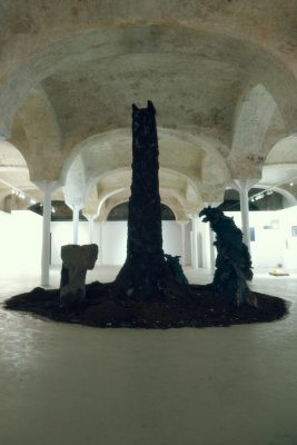 Если в предыдущих проектах фанера использовалась для создания объемных скульптур и масштабных инсталляций, в новой экспозиции материал становится поверхностью для нанесения графического изображения с помощью кистей, акриловых маркеров, металлических щеток. Метод процарапывания, который использует художник, подчеркивает слоистость и отсылает к структуре земли, которую в серии «Землеродные» населяют нечеловеческие, подземные существа, а в серии «Откровения» – силуэты птиц, одного из ключевых и повторяющихся образов в практике автора.