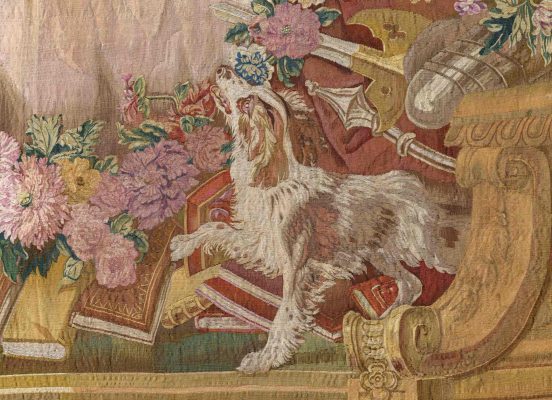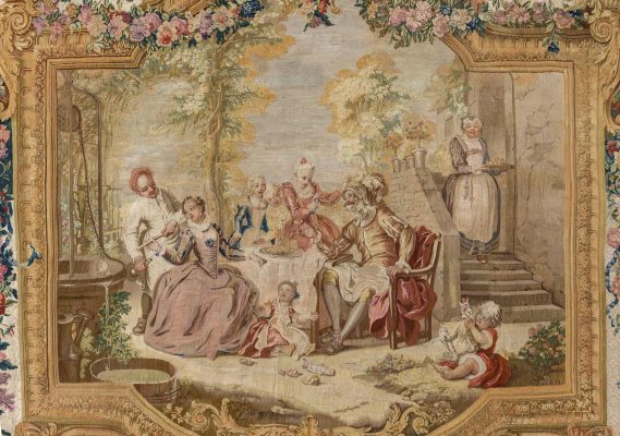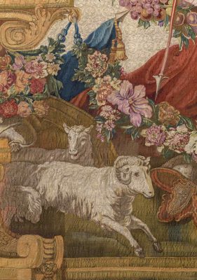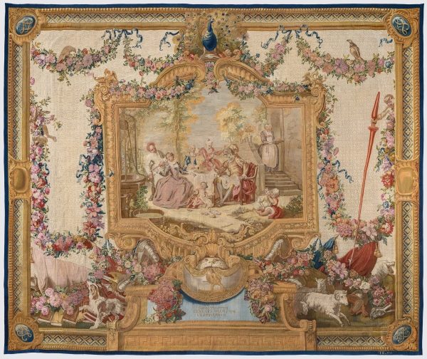 Гобелены из серии «История Дон Кихота» считаются самыми знаменитыми среди красивых декоративных изобретений XVIII века. Эта серия неоднократно повторялась и производилась на мануфактуре Гобеленов с 1718 по 1794 год. Этот гобелен, поступивший в Музеи Московского Кремля из Большого Кремлевского дворца в 1924 году, принадлежит к шестому повторению (1751–1763 годы, из двадцати трех ковров и шести портьер) с пятым декоративным обрамлением, написанным художником-орнаменталистом Валадом под руководством Шарль-Антуана Куапеля.
