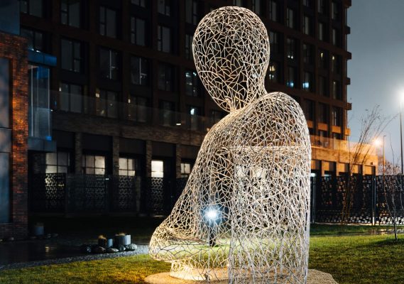 Если вы никогда не были в Сколково, есть повод восполнить пробел. Перед Сколковским институтом науки и технологий расположилась скульптура «Размышление о происхождении человека» художника Антона Смита из ЮАР. Это первая работа знаменитого южноафриканского скульптора в России. Она воплощает сложную гармонию двойственности. Скульптура создана из металла и стекловолокна, но при этом обладает «земным» характером – кажется, что при работе над текстурой лица использовалась глина.