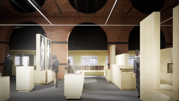 Часть выставки «Грядущее» обращена в будущее: мультимедийная инсталляция, созданная с помощью нейросетей, визуализирует художественные решения для новых станций, которые будут построены в ближайшем будущем.