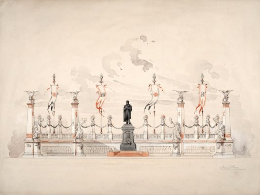 Отдельная тема выставки – проекты мемориальных сооружений и эскизы оформления городских пространств, созданные в честь событий государственной важности. Некоторые из них относились к числу неизвестных и были атрибутированы в ходе подготовки проекта.