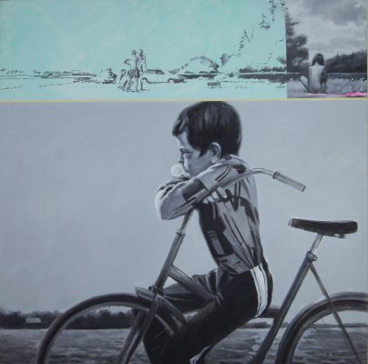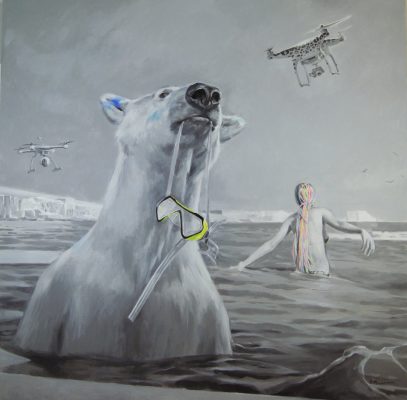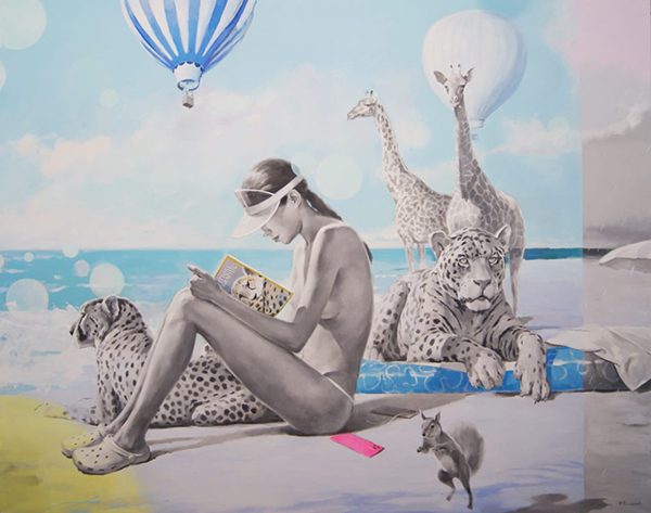 Ключевым персонажем картин художника становится женщина, которая предстает перед зрителем как олицетворение жизни, созданное природой. Помещенная в естественную среду или городской пейзаж, она окружена различными умными гаджетами: дроны летают над ее головой, словно птицы, принося посылки и подарки, а робопсы сопровождают ее на прогулке. Поверхность холста зачастую покрыта трещинами, имитируя жидкокристаллический экран. Таким образом, цифровой мир становится частью реального.