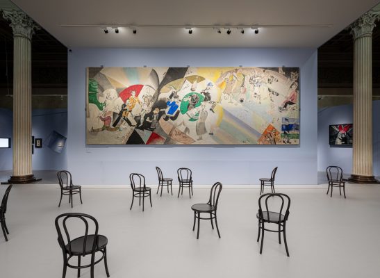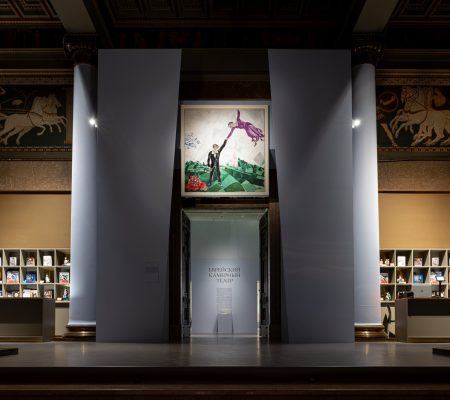 Центром экспозиции в Белом зале музея стала реконструкция зрительного зала Еврейского камерного театра, для которого художник в 1920 году создал девять панно. Здесь же посетители смогут ознакомиться с письмом Шагала в дирекцию Еврейского театра с просьбой дать возможность увидеть его работу не только публике, посещающей спектакли, но и всем желающим.