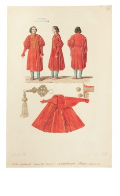 Спустя две недели после кончины Петра I было отпечатано объявление о ношении траура по почившему императору. Составить представление об особенностях придворного траурного костюма того времени, его колористической гамме, отделке и аксессуарах помогают уникальные предметы одежды, принадлежавшие Петру I и его внуку, великому князю Петру Алексеевичу (будущему императору Петру II).