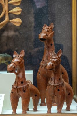 К алтарям двух самых важных божеств, которым поклоняются в районе Банкура, – Манасы и Дхармараджа (бога Солнца) деревенские жители делают подношения, расставляя в местах для поклонения сотни терракотовых фигур лошадей и слонов. Их изображения, связанные с культом духов предков деревни и олицетворяющие богатство, власть и невероятную силу, могут быть небольшими, легко помещающимися в ладонь, или огромными – выше человеческого роста. В экспозиции представлены скульптуры коней, искусно вылепленных из глины, а также отлитых из металла в технике дхокра.
