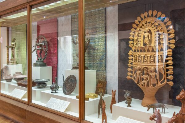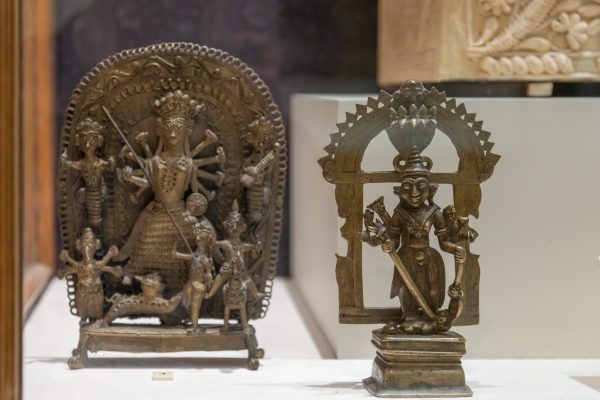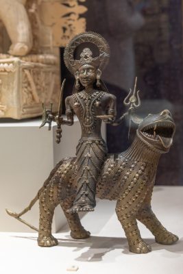 Скульптура богини и композиция с мифологическими персонажами выполнены в технике дхокра. Это традиционное искусство литья по выплавляемым восковым моделям из сплавов на основе меди в индийских селениях практикуется веками. Созданные в технике дхокра изделия отличаются характерным декором поверхности, в котором сплетены параллельные и спиральные линии, решетчатый узор и элементы зерни. В обновленной экспозиции шесть таких скульптур.