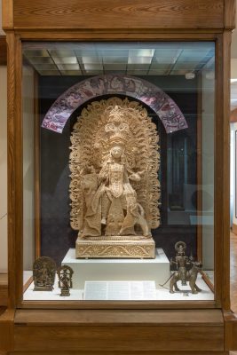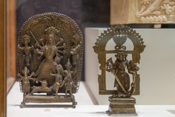 Центром одной из витрин было скульптурное изображение важнейшей индуистской богини Дурги. Она создана в традиционной бенгальской технике «шолапит» из тростника шола. Богиня представлена в облике прекрасной многорукой женщины, восседающей на тигре. В эту витрину добавили репродукцию нарисованного в технике «калигхат» полукруглого фриза «чалчитра» – декоративного элемента индуистского храма с изображениями мифологических сцен.