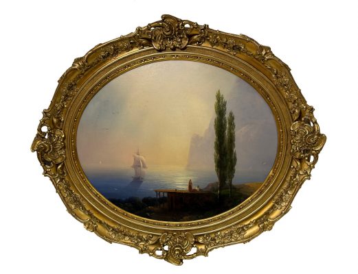 Полотно «Крымский пейзаж» изящного овального формата не только подписано, но и датировано автором 1856 годом. К этому времени Айвазовский, удостоенный многочисленных наград и звания живописца Главного морского штаба, уже несколько лет как проживал в Феодосии и даже завершил самую популярную картину в своей карьере – «Девятый вал». Именно в 1850-е годы искусство Айвазовского зазвучало в полную силу. На своих полотнах мастер отражал природу Крыма, от Евпатории до Керчи, запечатлевая особенности побережья при солнечном и лунном освещении. Опираясь на натурные эскизы, художник дополнял свои пейзажи деталями, сделанными по памяти, стремясь передать общее настроение в пейзаже и бесконечную изменчивость морской стихии.