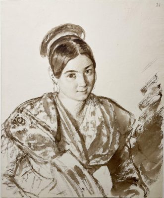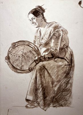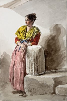 О существовании «Итальянского альбома», происходящего из собрания Стефании и Льва Витгенштейнов – близких знакомых Карла Брюллова, впервые стало широко известно в 1993 году, когда он был выкуплен в Лондоне у наследников четы Витгенштейнов и перешел в коллекцию российского банка. С тех пор эта великолепная подборка графических листов, раскрывающая творческую «кухню» одного из величайших русских художников – «божественного» или «великого Карла», как его называли современники, была фундаментальным образом изучена сотрудниками Русского музея и Эрмитажа. Листы из «Итальянского альбома» (в основном это рисунки графитным карандашом и акварели) были исполнены во время первой поездки Брюллова в Италию в 1823–1835 годах. В них молодой художник проявил себя как виртуозный рисовальщик и запечатлел настоящую галерею итальянских «типов» – от монахов и пилигримов, волынщиков и пастухов до «карбонариев» – итальянских революционеров начала XIX века. Особое место в альбоме занимают женские образы. Чувственные брюнетки с большими миндалевидными глазами, укутанные в шали ручной работы или одетые в национальные костюмы и головные уборы, по которым можно определить их происхождение вплоть до названия города, – эти девушки стали прототипами красавиц на больших живописных полотнах художника.