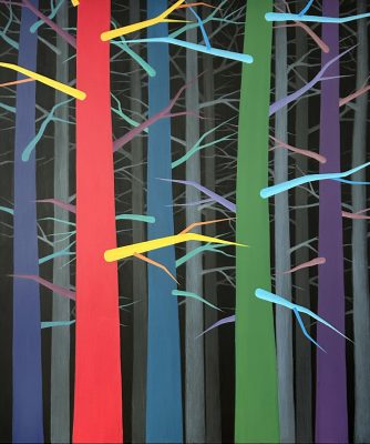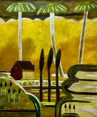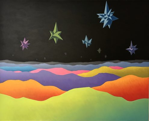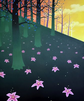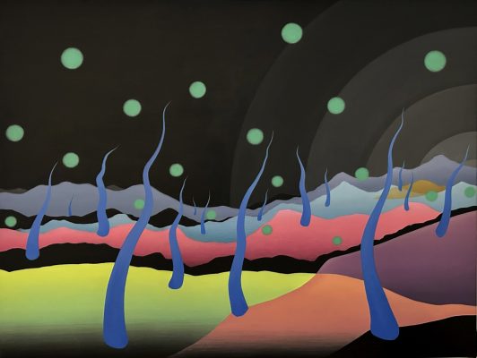 В своеобразное путешествие отправит посетителей и Станислав Шурипа. В его персональную выставку, которая так и называется – «Ночное путешествие», вошли масштабные живописные полотна, созданные в 2025 году. Формально все они относятся к жанру пейзажа, однако Шурипа создает особый мир, балансирующий на грани реальности и сновидений. Отдельные элементы ландшафта перестают играть роль фоновой декорации, внезапно увеличиваются в размерах, полностью занимая передний план композиции, и превращаются в главных героев сюжета. Особое значение приобретает и цвет фона – варьируя от беспросветного черного до ярких, почти ядовитых оттенков, он маркирует разные стадии сна. Автор утверждает, что по дороге от темного пространства засыпающего мозга к сновидениям на стадии глубокого сна наступает момент, когда знакомые образы внезапно трансформируются, а законы природы мгновенно изменяются, образуя новую реальность.
