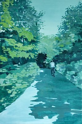 Работы Дарьи Барыбиной, наоборот, можно назвать сентиментальными и лирическими. Однако, формально отсылая зрителя к живописной традиции конца XIX века, Барыбина изображает не величественную природу, а искусственный городской оазис, который дарит жителям мегаполиса возможность расслабиться и скрыться от тревог – не только внешних, но и внутренних. Большую часть работ наполняют оттенки зеленого и желтого, другие работы контрастны и выполнены в розовых и фиолетовых тонах.