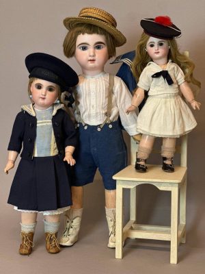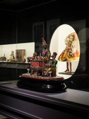 В конце XIX века для европейских кукол, продававшихся в России, начали шить наряды, вдохновленные традиционными костюмами губерний Российской империи. Среди экспонатов выставки представлен набор из восьми тряпичных кукол в национальных костюмах народов Российской империи, созданный по случаю официального визита во Францию в 1896 году императора Николая II и подаренный его семье.