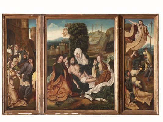 Иной аспект истории нидерландского искусства XVI века, так называемый «антверпенский маньеризм», представлен триптихом «Оплакивание Христа», исполненным предположительно Мастером Поклонения из собрания фон Грооте, и одноименной композицией кисти также анонимного художника из Брюгге, именуемого Мастером Святой Крови. А «Веселое общество» мастерской Яна Массейса – показательный образец самостоятельного бытового жанра.