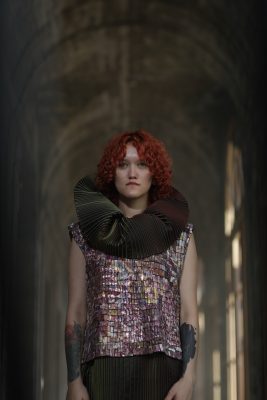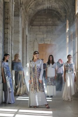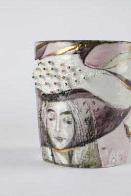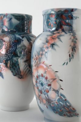 В аванзале – две чашки с автопортретом художницы, расписанные надглазурными красками, золотом и монохромным пером в технике pâte-sur-pâte (или «масса на массе»), старинной, сложной и очень неторопливой манере росписи по керамике. Во втором зале гостей встречают 15 ваз с говорящими во времени формами – «антоновка», «фрезия», «лилия», «ламповая», «карелия», «папирус», «русская», «большая китайская», – составленные в композицию на фоне мозаичного триптиха, занимающего всю стену. А в зале по соседству – сюита «Волшебный сад. Времена года» из семи «фарфоровых» платьев. Каждое платье собрано из тысяч крохотных фарфоровых пластов, закрепленных с помощью мононити на шелке, органзе, хлопке или шерсти. В той же технике созданы и семь декоративных воротников. В отдельной витрине – браслеты, серьги и перстень от петербургских сестер-ювелиров Натальи и Татьяны Тарасовых, к которым Чапургина добавила расписные фарфоровые пластины, а также флаконы для парфюма, две сумки (целиком из фарфора) и чайный сервиз на шесть персон Timeless But Not Classic.