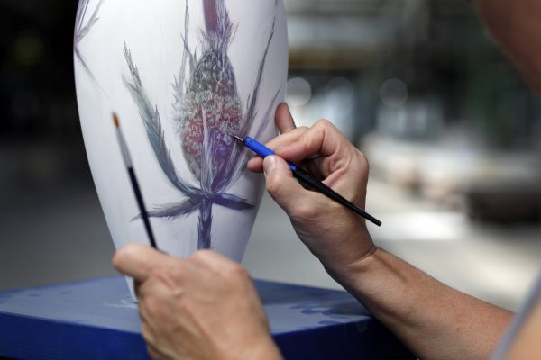 Что же такое фарфор? Пятьдесят процентов глины, двадцать пять процентов кварца и двадцать пять процентов калиевого полевого шпата – классический состав твердого фарфора. Любые изменения в рецептуре недопустимы. Сказать, что именно такой рецепт изобрел в XVIII веке Дмитрий Виноградов, нельзя, ведь в то время химии как таковой не было, и все определялось по сырью. «Фарфор – это породы из природы, – говорит Татьяна Чапургина. – Масса, с которой я работаю, в готовом виде похожа на жидкую сметану. Я выливаю ее на гипсовый пласт, докатываю до нужной толщины и режу на определенные формы, которые мне нужны для проекта». Подготовка «фарфоровой» ткани похожа на ткачество: художник разрисовывает пласты, каждый размером с фалангу пальца, и собирает из них будущее полотно. Пока пласты сырые, в каждом проделывают отверстия (минимум четыре) и отправляют в печь. Только после этого они становятся фарфором.