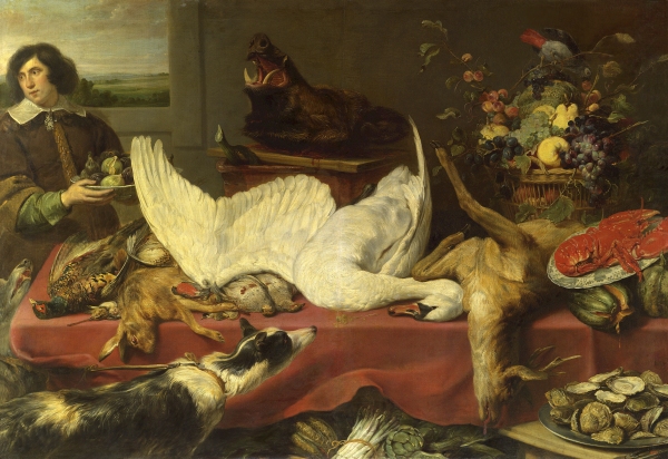 Помимо Фландрии, в Европе XVII века были и другие центры развития натюрморта – Германия, Италия, Испания. Но именно фламандцы чаще всего выступали с новыми творческими идеями и оказывали влияние на своих соседей. Франс Снейдерс – один из главных представителей жанра в то время – более всего известен своим мастерством в изображении охотничьих трофеев, разнообразной дичи, кухонь, рынков и торговых лавок. На выставке зрители смогут не только увидеть «классического» Снейдерса, но и проследить за эволюцией творческой манеры мастера. Самой ранней из его работ в экспозиции станет «Натюрморт с устрицами и куропатками» из собрания Международного института культурного наследия. Что же касается картины «Статуя Цереры» из Государственного Эрмитажа, то написать в ней гирлянду из плодов и цветов Снейдерса пригласил Питер Пауль Рубенс.