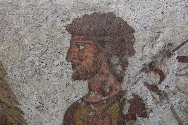 На оштукатуренной туфовой плите изображен молодой мужчина с бородкой и пышной кудрявой шевелюрой верхом на коне рыжей масти. На всаднике короткая кираса и золотой пояс, надетые поверх красной туники, что выдает в нем воина. Голова его, однако, не покрыта шлемом, а из оружия видно лишь копье, с которого свисает белая туника, украшенная пурпурной каймой и обагренная кровью, – трофей, захваченный у убитого врага.