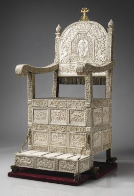 Такой известный экспонат Оружейной палаты, как Костяной трон, в XIX веке воспринимался как дар, якобы поднесенный греческим послом великому князю Ивану III Васильевичу по случаю его бракосочетания с Софьей Палеолог. Позже он и вовсе обретает нового вымышленного владельца в лице царя Ивана Грозного – вполне возможно, из-за хорошо известной скульптуры М. М. Антокольского (1843–1902), изобразившего Ивана IV именно на этом троне. Фантастической биографией обзаводится и созданная в 1682 году Шапка Мономаха второго наряда – она становится «венцом великой княгини Ольги», которая вывезла его из Царьграда, а также короной, которая «употреблялась царем Иоанном Васильевичем в меньших выходах».