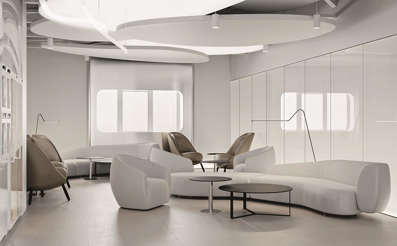 Теперь гостей терминала встречает уютный, современный и светлый интерьер. Единый стиль и концепция прослеживаются по всему периметру терминала. Ненавязчивый отсыл к авиапутешествиям проявляется в форме окон, напоминающих иллюминаторы, и подвесных конструкциях потолка, похожих на облака. Для комфорта гостей по периметру лаунж-зоны установлены точечные подвесные светильники, рассеивающие мягкий свет.