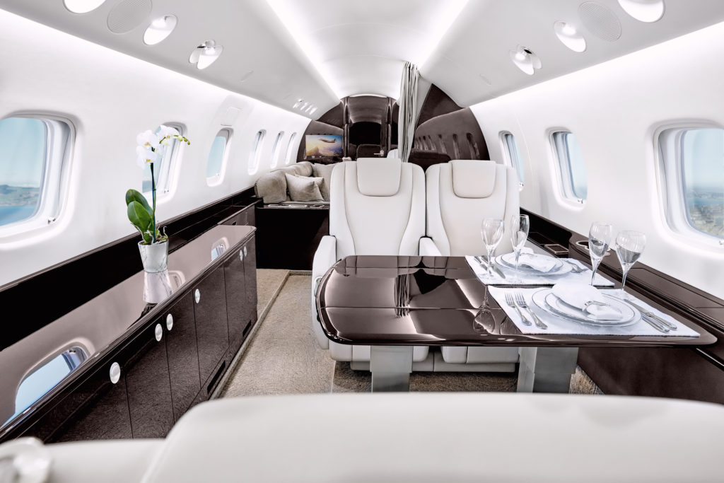Диван и сдвижные кресла, в зависимости от выбранной конфигурации, позволяют развернуть до шести спальных мест на время продолжительных перелетов. Стандартное число пассажирских мест – 13. Кухня, расположенная в носовой части, оборудована встроенной мебелью, микроволновой печью и кофеваркой. Из просторной туалетной комнаты в хвостовой части фюзеляжа можно попасть в багажное отделение во время полета. Трехзонная компоновка позволяет устроить в салоне купе для отдыха с раскладным диваном, отделенное перегородкой и плотной сдвижной шторкой. Ну а габариты пассажирского салона просто впечатляют: ширина 2,10 м, высота 1,82 м, что для суперсреднего класса великолепно.