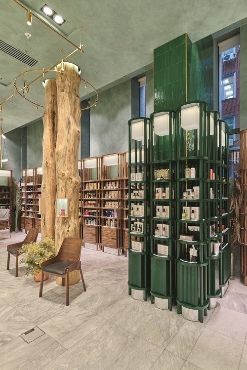 Концепция интерьера обновленного магазина строится вокруг сотрудничества человека и природы – натуральные материалы в отделке, элементы растений в декоре. Большое светлое пространство удобно разделено на несколько зон – это нишевая парфюмерия, мировые косметические гиганты, в третьей зоне разместились азиатские марки, коллекция БАДов, детский уход и спа-кабинеты.