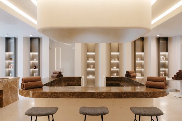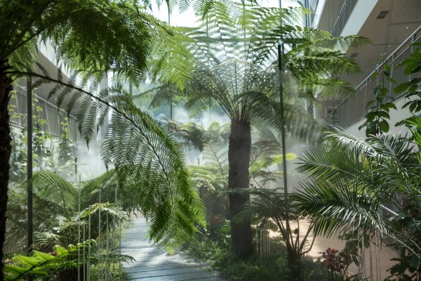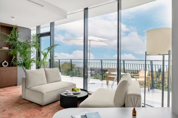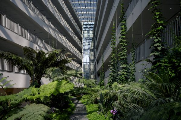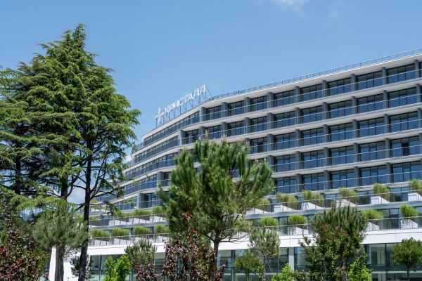 Футуристический облик здания с плавными линиями и каскадными балконами представляет собой современную интерпретацию древних террасных ландшафтов Хосты. Оно следует естественным изгибам местности, создавая эффект единства с окружающим пейзажем. Зеленые маршруты для терренкура и просторный атриум с зимним садом, где представлено 20 видов тропических растений, усиливают эффект полного погружения в природу.