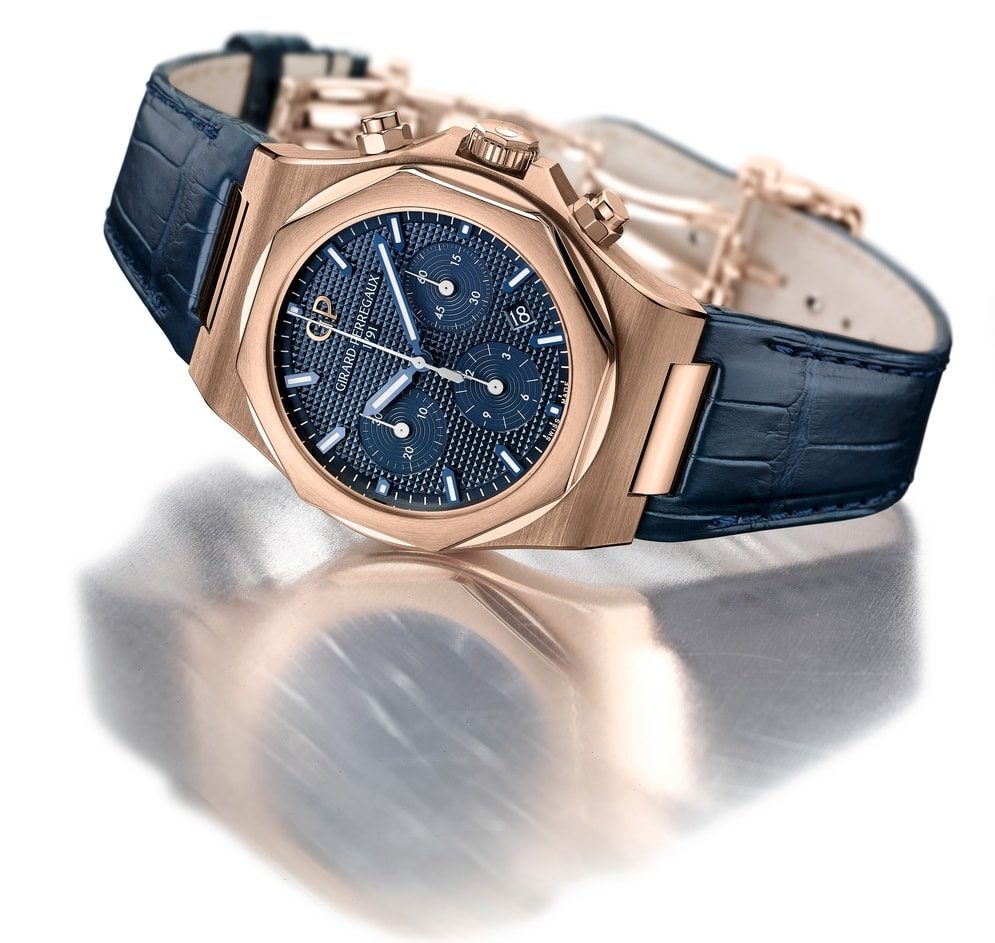 В 2016-м в Girard-Perregaux отметили сорокалетие коллекции «Laureato». Два года спустя флагманское семейство приросло хронографом в нескольких вариантах исполнения. Несмотря на современные акценты в экстерьере, модели по-прежнему демонстрируют надлежащую историческую преемственность. Стальные корпуса сочетаются с гильошированными циферблатами белого, черного либо синего цвета.