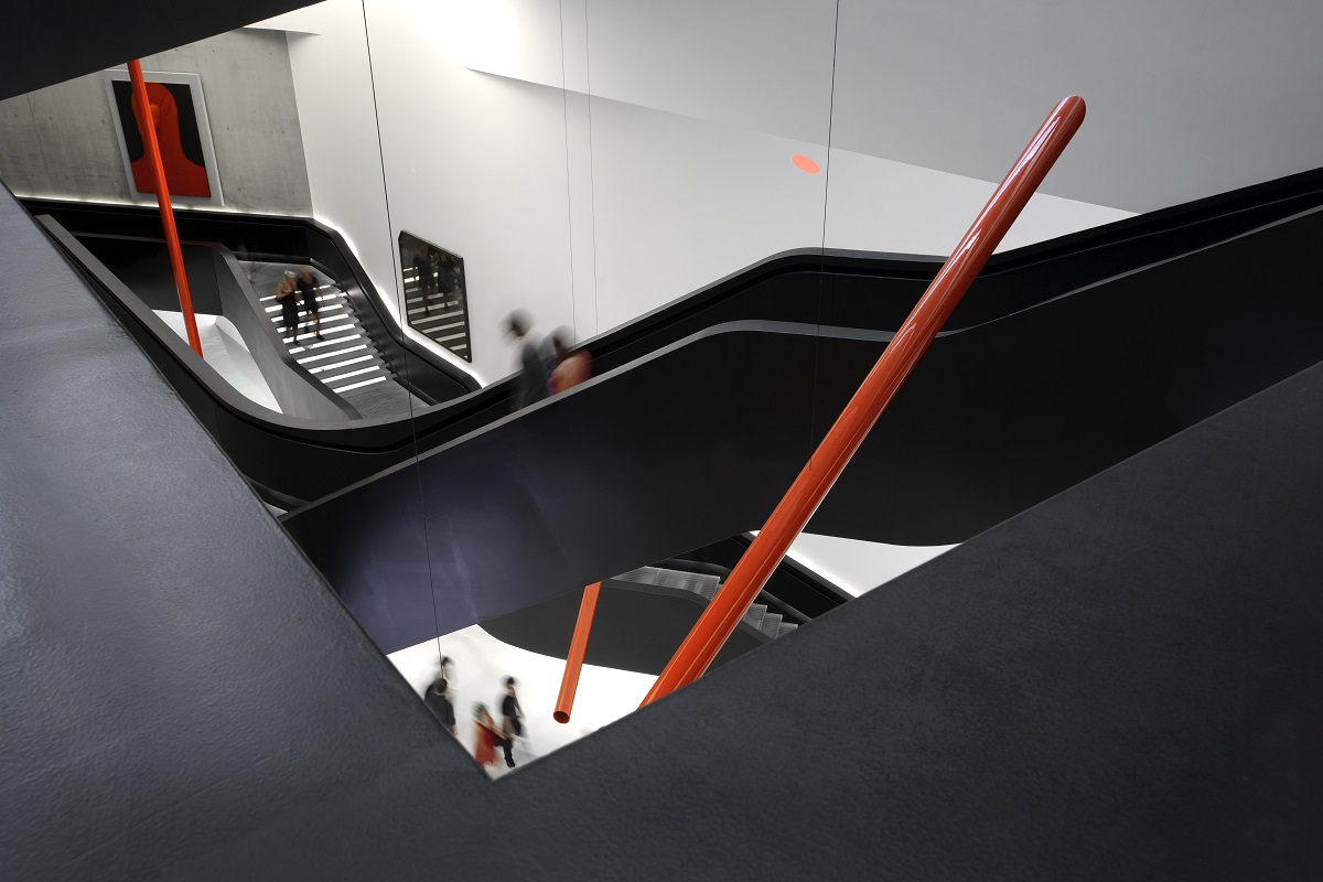Музей современного искусства в итальянской столице строили долго и мучительно – место для него хоть и выбрано на отшибе (район Фламинио, куда кроме как на такси не доберешься), но это был один из главных проектов Захи Хадид, призванный окончательно закрепить ее звездный статус. Удивительно, что интерьер здесь поражает больше, чем экстерьер. Снаружи – все технологично и просто (мощный пандус наваливается на тонкие алюминиевые колонки). Но внутри бесконечные перекрестки лестниц и переходов создают настоящую музыку сфер.