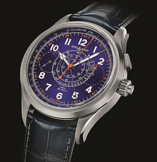 Сплит-хронограф Montblanc 1858 Split Second Chronograph, выпущенный в количестве 100 единиц, базируется на винтажном военном хронографе Minevra 1930-х годов. Итерация года 2020 получила такую же, как у оригинала, характерную тахиметрическую шкалу в форме улитки, размещенную по центру циферблата, нанесенную на внутренний фланец телеметрическую шкалу и кафедральные часовую и минутную стрелки. А вот цвет циферблата разнится: в отличие от предшественника он не черный, а ярко-синий.