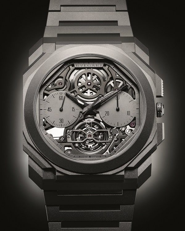 В Bvlgari в 2020-м установили шестой мировой рекорд (по одному в год), на этот раз представив самый тонкий в мире хронограф с турбийоном. Модель в титановом 42-миллиметровом корпусе работает на мануфактурном калибре BVL 388 с периферийным ротором. При этом толщина механизма составляет скромные 3,5 мм.
