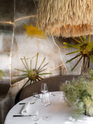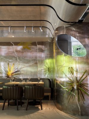 Интерьер ресторана создала дизайн-студия «Геометрия» Ирины Глик. По потолку летит огненный дракон – медная люстра, пронизывающая весь зал. Обеденная зона плавно переходит в каменные изломы открытой кухни. А свет из больших панорамных окон бликует на украшающих стены гигантских цветах.