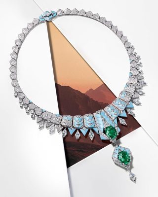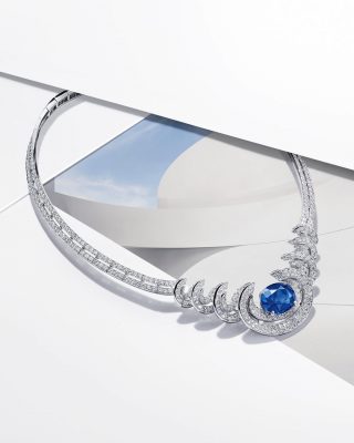 Динамичное колье Sama с цейлонским сапфиром весом 19,27 карата воспроизводит кружение юбок суфийских дервишей, а колье Girih c замбийскими изумрудами и бирюзой интерпретирует геометрические исламские мотивы. Ритмичную игру бриллиантов в ожерелье Claustra оттеняют фрагменты оникса, они же придают глубину и объем этому украшению-трансформеру. Широкое парадное ожерелье V-образного силуэта распадается на два колье. Panthere Givree – свежая интерпретация культовой героини Cartier пантеры: драгоценная скульптура пятнистой хищницы в колье окружена ледяным дыханием аквамаринов (общим весом 20,33 карата), лазурита и бриллиантов.