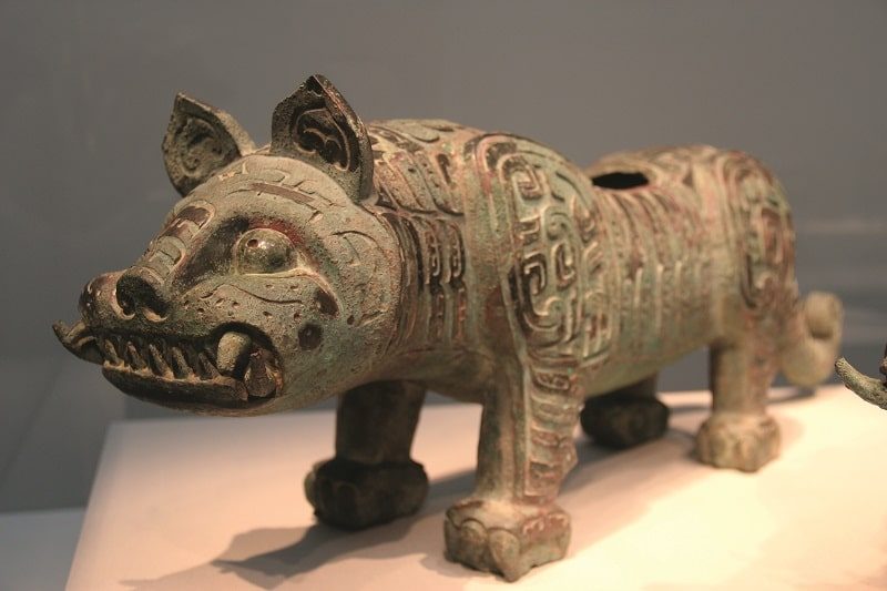 Китайский календарь включил тигра в число двенадцати зодиакальных животных, что говорит об его огромном почитании. Об этом же свидетельствует и археология – бронзовые и керамические фигурки и рельефы тигров находят в слоях I тысячелетия до н. э. Впрочем, наш европейский взгляд не сразу и различит, что это действительно тигры, так сложно фантазия китайских мастеров исказила их очертания. Изображения тигров служили оберегами от злых духов, а особую удачу приносил белый тигр.