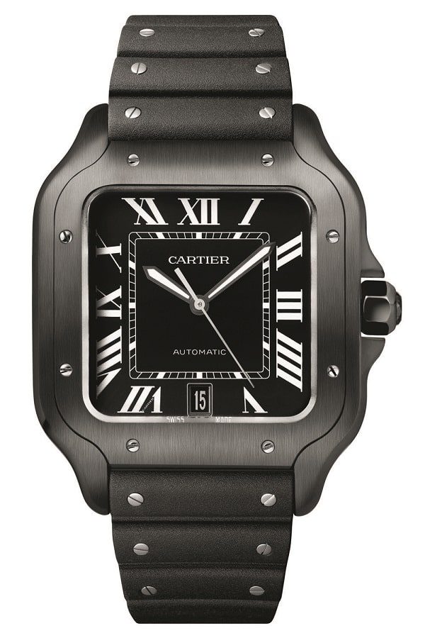 Начало знаковой коллекции Santos De Cartier положила модель, разработанная Луи Картье по просьбе друга (и по совместительству авиатора) Альберто Сантоса-Дюмона в 1904 году. Спустя 116 лет она приросла итерацией в каноническом корпусе, поверхность которого целиком обработана иссиня-черным ADLC-покрытием. К мануфактурному калибру 1847 MC и контрастному циферблату добавлены два ремешка – из кожи аллигатора и каучука, украшенного декоративными заклепками в форме миниатюрных самолетных винтов.