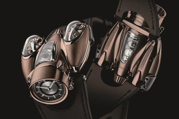 Максимилиан Бюссер, основавший марку MB&F, сделал ставку на ностальгию, заставляющую взрослых мужчин мысленно возвращаться к тем временам, когда они мечтали стать астронавтами или супергероями. Все работы нишевого бренда сверхкреативны как внешне, так и внутренне. Последняя в ряду «чудо-машин» Бюссера визуально напоминает футуристический летательный аппарат из какого-то фантастического кинофильма – хотя на самом деле объектами, на которые равнялся создатель, стали не космические корабли, а скоростные автомобили и самолеты 1940–1950-х годов. Хитроумный калибр, разработанный Филиппом Дюфуром, частично размещен в боковых «гондолах» (в каждой находятся баланс-спираль и спуск). Они в свою очередь объединены дифференциалом, вынесенным в «летную капсулу» посередине. Все это весьма впечатляет – как и то, что достанется новинка лишь 33 счастливчикам.