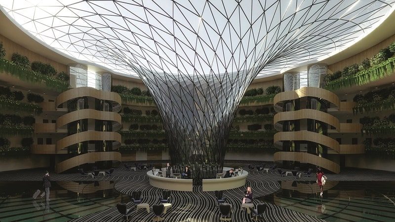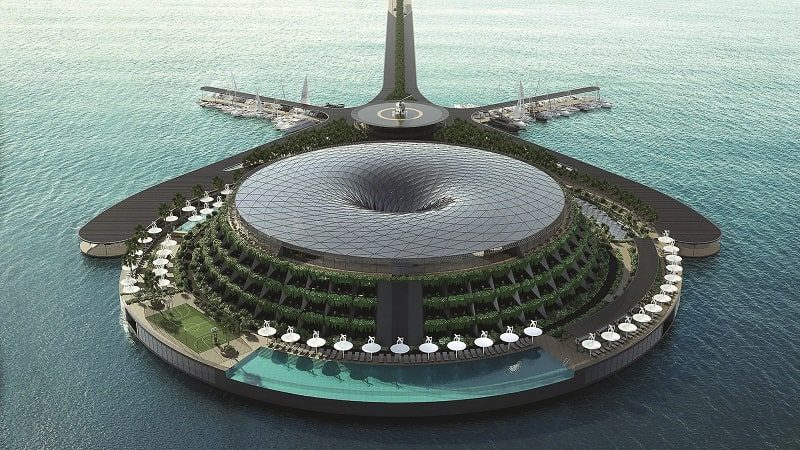 В Катаре анонсировано строительство плавучего комплекса Eco-Floating Hotel, который уже претендует на звание чуда архитектуры, а заодно и самого «зеленого» курорта в мире – он будет функционировать исключительно за счет солнечной, ветровой и приливной энергетики. Проект, разработанный Hayri Atak Architectural Design Studio (HAADS), поражает размерами. Общая площадь сооружения составляет 35 тыс. м2. Жилой корпус вынесен далеко в море; с сушей он связан полноценной автодорогой, на которой высажены деревья, но добраться можно и на вертолете – хелипад есть, и на судне – к двум стационарным пирсам могут швартоваться даже мегаяхты. Центральный вестибюль площадью 700 м2 прикрыт полупрозрачной воронкообразной крышей, которая напоминает круглый слив на водохранилище (так называемый шахтный водосброс), но эффектное темное стекло – не что иное, как солнечные панели. Форма купола также позволит собирать дождевую воду для полива растений и технических целей. Три верхних этажа займут 152 комфортабельных гостиничных номера с висячим садом на каждом балконе.