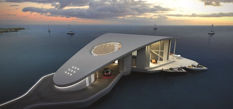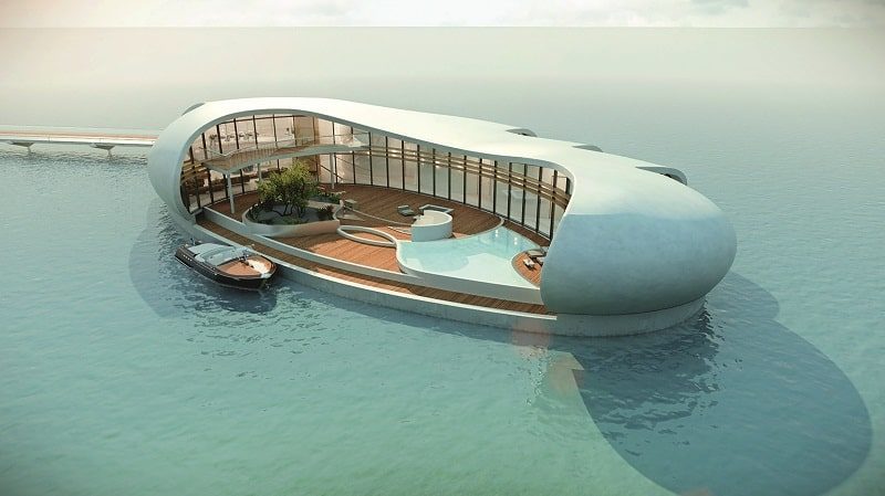 «Органическая» архитектура и белый цвет этих домиков вызывают ассоциации с гигантскими фасолинами, которые, между прочим, обеспечивают своим обитателям высокий уровень privacy: внешняя сторона полукруга представляет собой сплошную стену-крышу, а остекление и терраса расположены по внутренней дуге, защищенной по бокам изгибами здания. Концепция, предложенная голландской компанией New Living on Water, предлагает набор стандартизированных модулей схожего вида, но разного размера, из которых при желании возможно формировать на воде целые поселки.