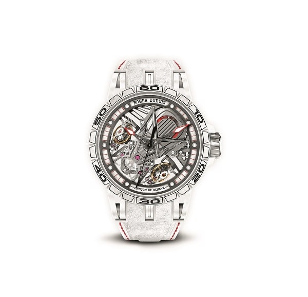 Очередной плод этого партнерства – выпущенная всего в восьми экземплярах модель Excalibur Aventador S, которую можно приобрести только онлайн. Некоторые элементы дизайна эти часы позаимствовали непосредственно у своего прообраза с ревущим мотором. Среди них – два модуля баланс-спираль, расположенные под углом 45 градусов, характерные распорки, как в стойках автомобильной подвески, и индикатор запаса хода в стилистике приборной панели гоночного автомобиля. Кроме того, в этих часах впервые в мире использовано керамическое композитное волокно: материал, который на 20% легче карбона, создан по технологии, разработанной Roger Dubuis.