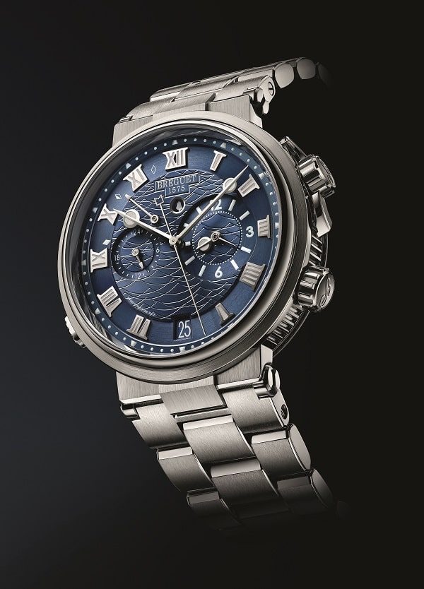 Мало что изменилось в новейшей итерации Breguet Marine Alarme Musicale 5547: все тот же 40-миллиметровый корпус из 18-каратного белого золота с рифленым корпусным кольцом, индикаторы будильника и GMT c 24-часовой шкалой, разметка римскими цифрами. Вот только циферблаты теперь – еще и в актуальном синем цвете.
