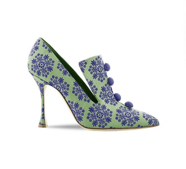 В России будут представлены туфли Trianon цвета лайма и сирени из шелковой парчи с четырьмя кожаными пуговицами и высоким каблуком. Украшенные принтами с цветочными мотивами, они отсылают нас к образу Марии-Антуанетты и чрезвычайно женственному, аристократичному и чувственному стилю рококо, господствовавшему во время правления этой королевы. Кстати, то, что целая линейка в новой коллекции бренда посвящена французской теме, далеко не случайность – прошлым летом у Manolo Blahnik наконец открылся первый в Париже бутик.