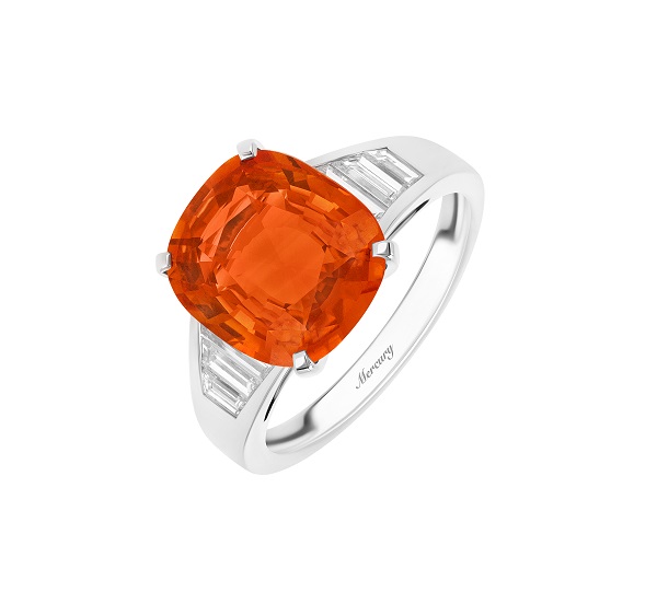 Специально для каждого ювелирного изделия профессиональные геммологи отбирают лучшие, соответствующие всем международным стандартам самоцветы. Драгоценные камни ярких и насыщенных цветов, представленные в классических изысканных украшениях, поражают глубиной оттенков и совершенством выверенных линий. На этот раз коллекцию Color впервые пополнило кольцо из белого золота с великолепным оранжевым сапфиром прямоугольной огранки, весом 6,04 карата. Центральный камень «поддерживают» шесть бриллиантов огранки «багет».