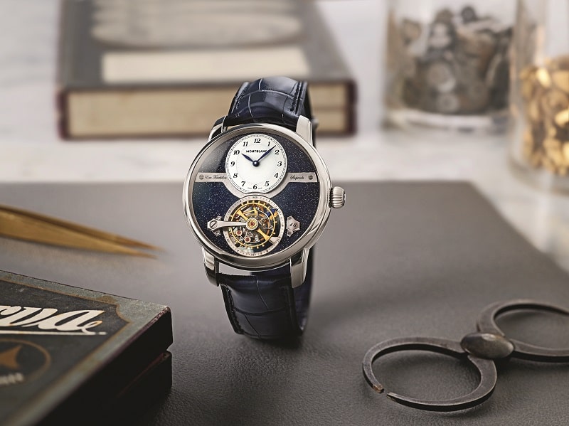 Часы оснащены запатентованным усложнением в виде парящего турбийона Suspended Exo, разработка которого длилась три года. Мастерам удалось сохранить впечатляющее большое балансовое колесо – оно поднято на 3,2 мм над циферблатом и словно парит в воздухе – и в то же время избежать увеличения размера механизма или корпуса. «Подвешенное» расположение стало возможным благодаря специальному мосту турбийона лишь с одним изогнутым рычагом. По установившейся традиции механизм MB M16.68 был декорирован вручную мастерами Montblanc на мануфактуре в Виллере. Полностью полированный корпус диметром 44,8 мм изготовлен из 18-каратного белого золота. Тираж модели – всего 18 экземпляров.