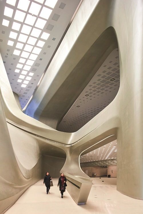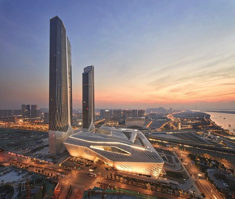 Международный молодежный культурный центр в Нанкине – еще один мегапроект Zaha Hadid Architects в Китае (открылся в конце 2018 года). Комплекс стоит на берегу реки Янцзы и связывает его с небольшим островом Цзянсиньчжоу, где расположена ландшафтная рекреационная зона. В состав комплекса входят две высотные башни (315 м и 225 м), объединенные наверху, и конгресс-центр с концертной площадкой. В небоскребах расположены гостиничные номера и офисы, конгресс-центр может использоваться как универсальная площадка. Без цитат из традиционного китайского искусства не обошлось и на этот раз: фасады корпусов украшает витиеватый рисунок из тысяч переплетенных линий – аллюзия на древнее искусство шелкоплетения юньцзинь.