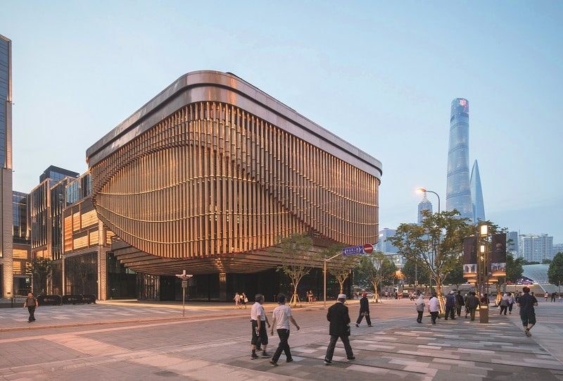 Культурный центр The Bund Finance Center, построенный в Шанхае в 2017 году, – еще один пример европейской архитектурной экспансии на восток. Трехэтажное «медное» здание, триумфально вырастающее между небоскребами, разработали два звездных британских бюро – Foster + Partners и Heatherwick Studio. Расположение новостройки (в самом центре финансового и делового района Пудун) и профиль заказчика (культурный фонд Fosun Foundation) определили ее структуру и функционал – территория современного искусства. Здесь предусмотрены театральный зал, пространства для инсталляций, выставок и концертов, а также образовательных программ и презентаций. Архитектура комплекса строится на динамическом эффекте: многослойные кинетические фасады, выполненные из множества медных труб, напоминают то ли струи водопада, то ли движение занавеса.