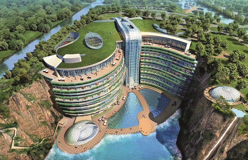 В начале 2019 года недалеко от Шанхая после 12 лет строительства открылся отель Shimao Wonderland Intercontinental, возведенный на месте заброшенного 88-метрового карьера. Проектируя необычную постройку, архитекторы из китайско-британского бюро Jade + QA руководствовались, по их признанию, принципами инь-ян – противопоставлением земного и небесного, мужского и женского. Полностью стеклянное здание подобно водопаду встроено в одну из стен карьера, спускаясь на 16 этажей ниже уровня земли. Два нижних этажа при этом полностью уходят под воду – здесь находятся бассейн, ресторан, аквариум и специальные «видовые» номера. Верхние этажи, вырастающие над землей, занимают стойка регистрации, ресторан, конференц-залы. Кроме того, тут расположены сады, зона отдыха и смотровая площадка.