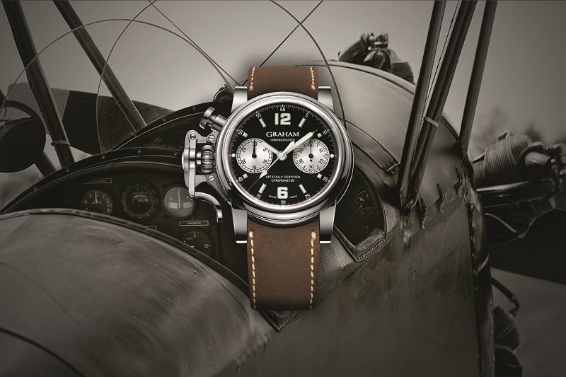 Бренд Graham, запущенный в 1995 году, уделяет особое внимание авиации: его новинка Chronofighter Vintage 25th Anniversary вдохновлена часами британской авиации времен Второй мировой войны. Она оснащена одной из самых узнаваемых деталей марки – большим пушером курком над заводной головкой. Эта система запуска и остановки хронографа расположена слева, что очень удобно в использовании. Юбилейная модель выпущена ограниченной серией в 25 экземпляров и имеет сертификат COSC.