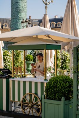 Летняя терраса Ritz Paris площадью 200 кв. м расположилась прямо у подножия Вандомской колонны, одного из самых знаковых монументов Парижа. Это произошло впервые – никогда прежде столь престижная локация не предлагала возможности наслаждаться летними вечерами за столиками на свежем воздухе. Изящные живые изгороди, нежный жасмин, вьющиеся розы и плющ обрамляют террасу, наполняя цветочными ароматами. Плетеная и кованая мебель напоминает о парижских бистро, а декор в зелено-белую полоску навевает воспоминания о традиционных приморских курортах.