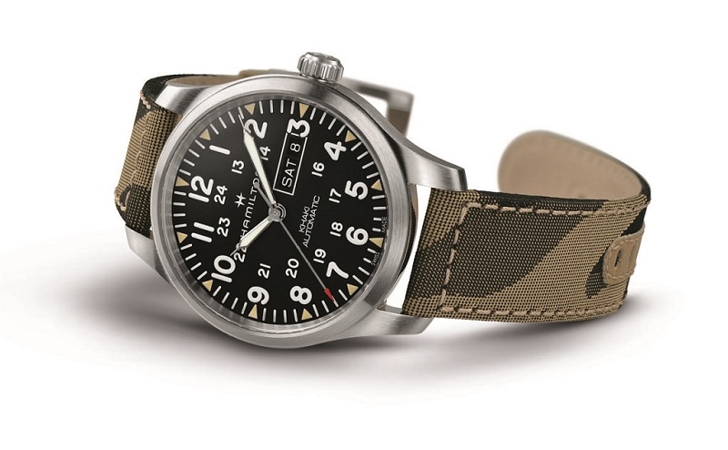 Что касается компании Hamilton, то она со своей целевой аудиторией определилась еще в 1940-х годах, взявшись за поставку высокоточных часов Вооруженным силам США. Правда сегодня речь идет не столько о людях в форме, сколько о бравых парнях вообще. Коллекция «Khaki Field Camouflage» как раз для них, бесстрашных первопроходцев, не признающих компромиссов при выборе функциональных и стильных часов, которые не подведут ни в горах, ни в пустыне, ни в море. Матовый циферблат новой модели от Hamilton представлен в трех цветах – зеленом, защитном и черном – и отлично гармонирует с ремешком, имеющим внутреннюю отделку из мягкой кожи и верхний слой из гладкого нейлона с рисунком. Превосходное считывание показаний обеспечивают крупные арабские цифры белого цвета, а также люминесцентное покрытие стрелок и меток. И главное: запас хода Khaki Field Camouflage равен 80 часам.